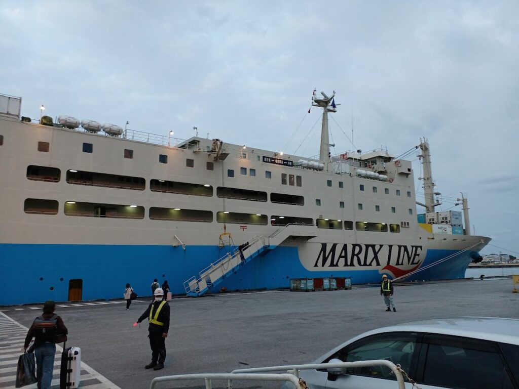 乗船手続きを済ませ、6時30分。巨大な船体を間近に眺めながら、マリックスライン「クイーンコーラルプラス」鹿児島港行きに乗船です。