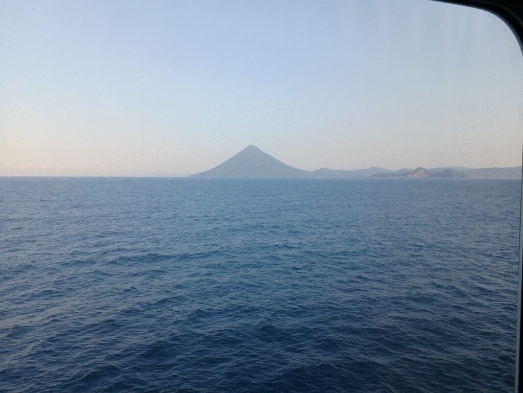 ブルートレインの開放式B寝台を思わせる2段ベッドで眠り、朝6時ごろ目覚めると目の前にはきれいな円錐形の山が。そう、開聞岳です。そしてそのふもとには、日本最南端の駅として知られる西大山駅があるはず。