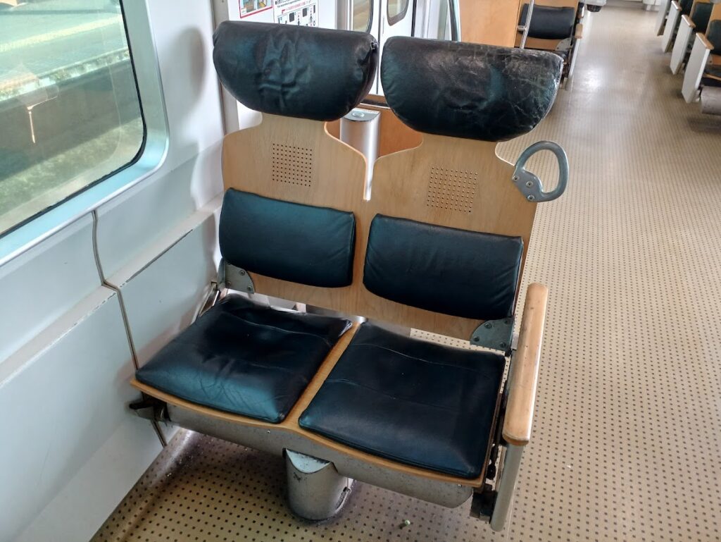 この座席、見た目は水戸岡デザインらしく奇抜なのですが、近郊型電車としては珍しく本革張りを採用していることもあってか、案外座り心地は悪くありません。錦江湾と桜島の景色が美しい海側の座席を確保し、発車を待ちます。